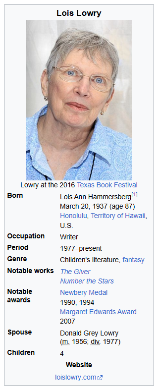 Lois Lowry is an American author born in 1937. She has written over thirty novels that range in genre. She has readers of all ages, though her primary audience is elementary school-aged children to young adults. Lois describes her writing on her website: ” My books have varied in content and style. Yet it seems that all of them deal, essentially, with the same general theme: the importance of human connections.”